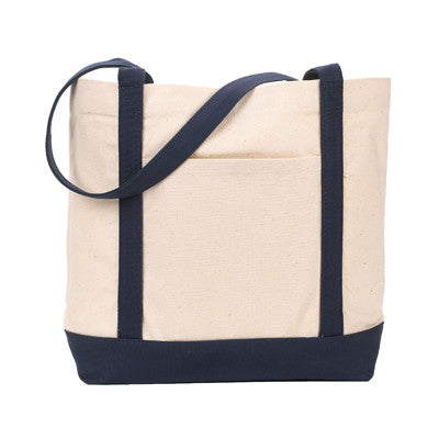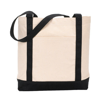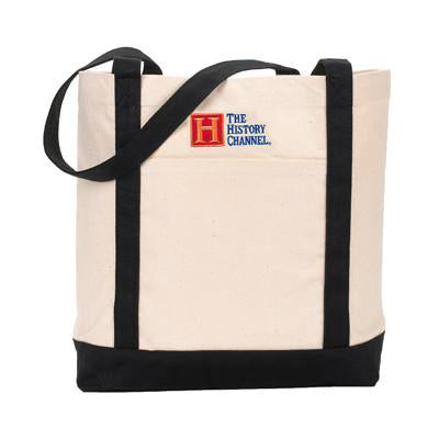 Features: Cotton canvas; snap closure; contrast bottom and 22-inch double-stitched handles; open front pocket; 5-inch x 4.5-inch approx. front pocket center imprint area; 3-inch diameter max. front pocket embroidery area; measures: 5 inches in width x 12 inches in height x 16 inches in length; 12-ounce.